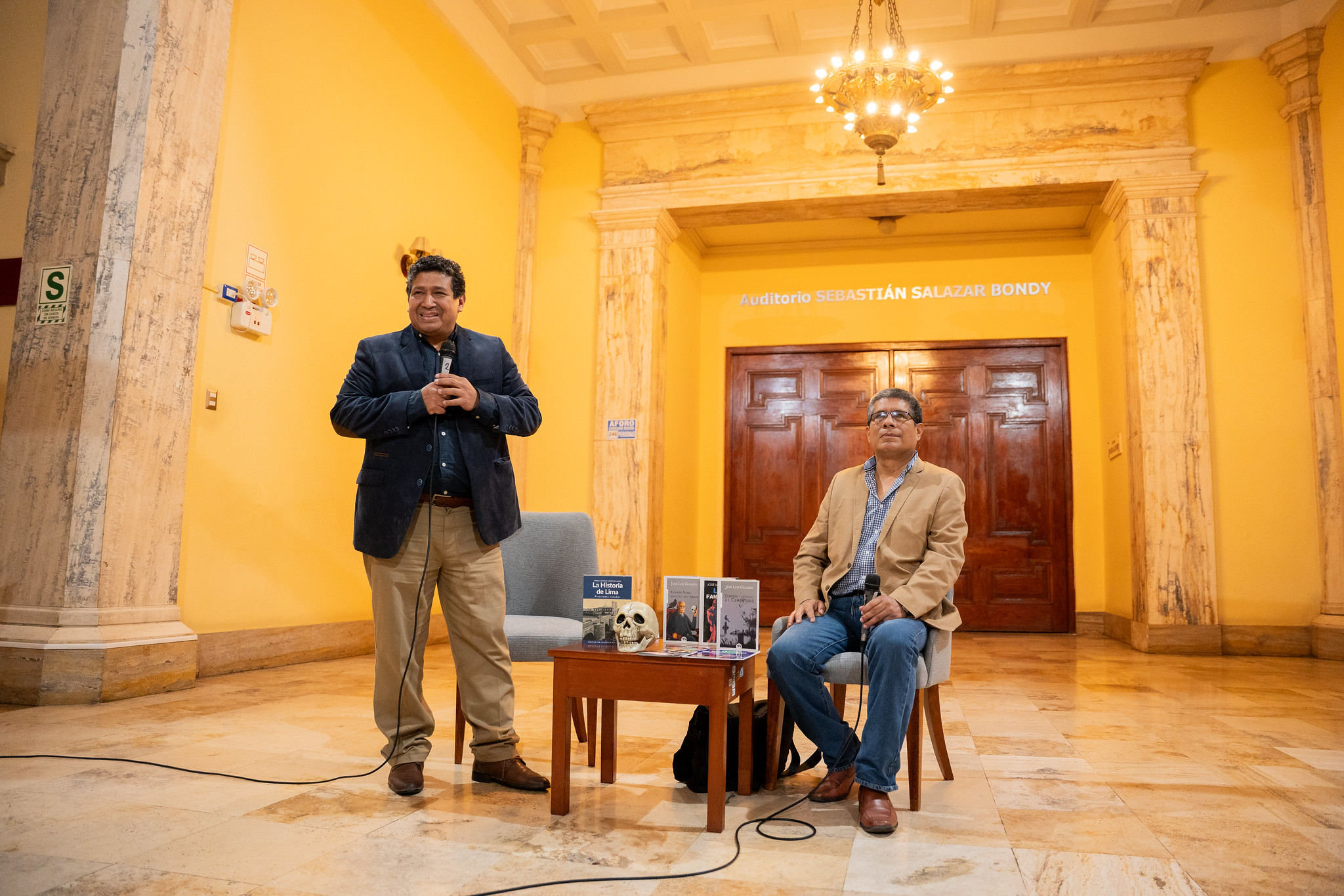 El conversatorio estuvo a cargo de José Luis Guardia (Papo Cuentacuentos) y del historiador Marco Antonio Capristán Núñez, quienes alternaron sus intervenciones narrando episodios sobre fantasmas y tragedias históricas que forman parte del imaginario limeño.