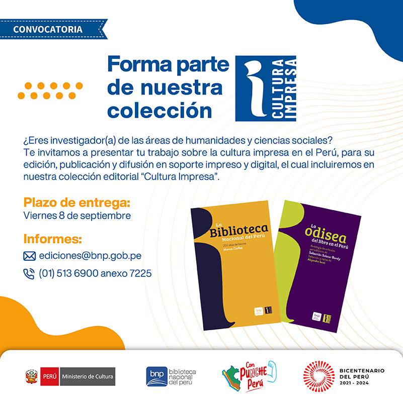 Teniendo como objetivo localizar y fomentar el surgimiento de nuevos campos de investigación sobre la historia del libro en el país desde un enfoque social y cultural, abarcando las diferentes etapas de nuestra historia, la Biblioteca Nacional del Perú (BNP), entidad adscrita al Ministerio de Cultura (Mincul), lanza la convocatoria para presentar trabajos sobre la cultura impresa en el país.