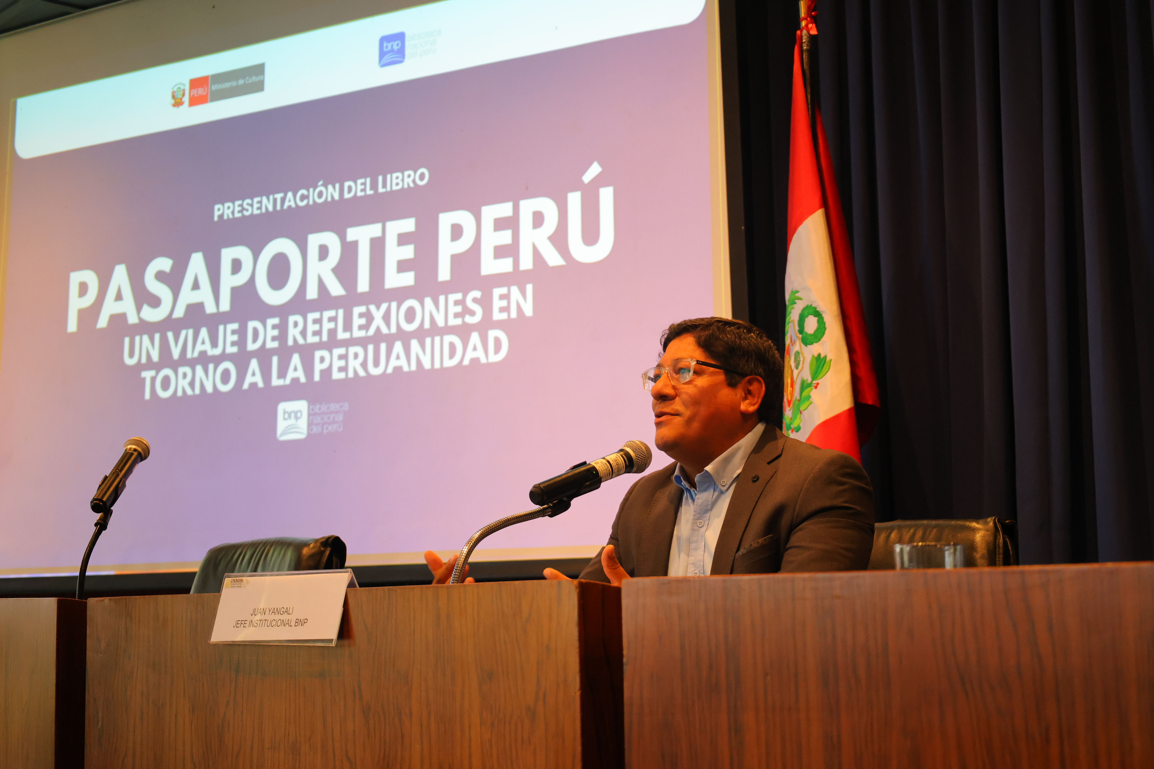 El jefe institucional de la Biblioteca Nacional del Perú (BNP), Juan Yangali Quintanilla, presentó oficialmente la publicación Pasaporte Perú: un viaje de reflexiones en torno a la peruanidad en el auditorio de la Facultad de Letras y Ciencias Humanas de la Universidad Nacional Mayor de San Marcos (UNMSM).