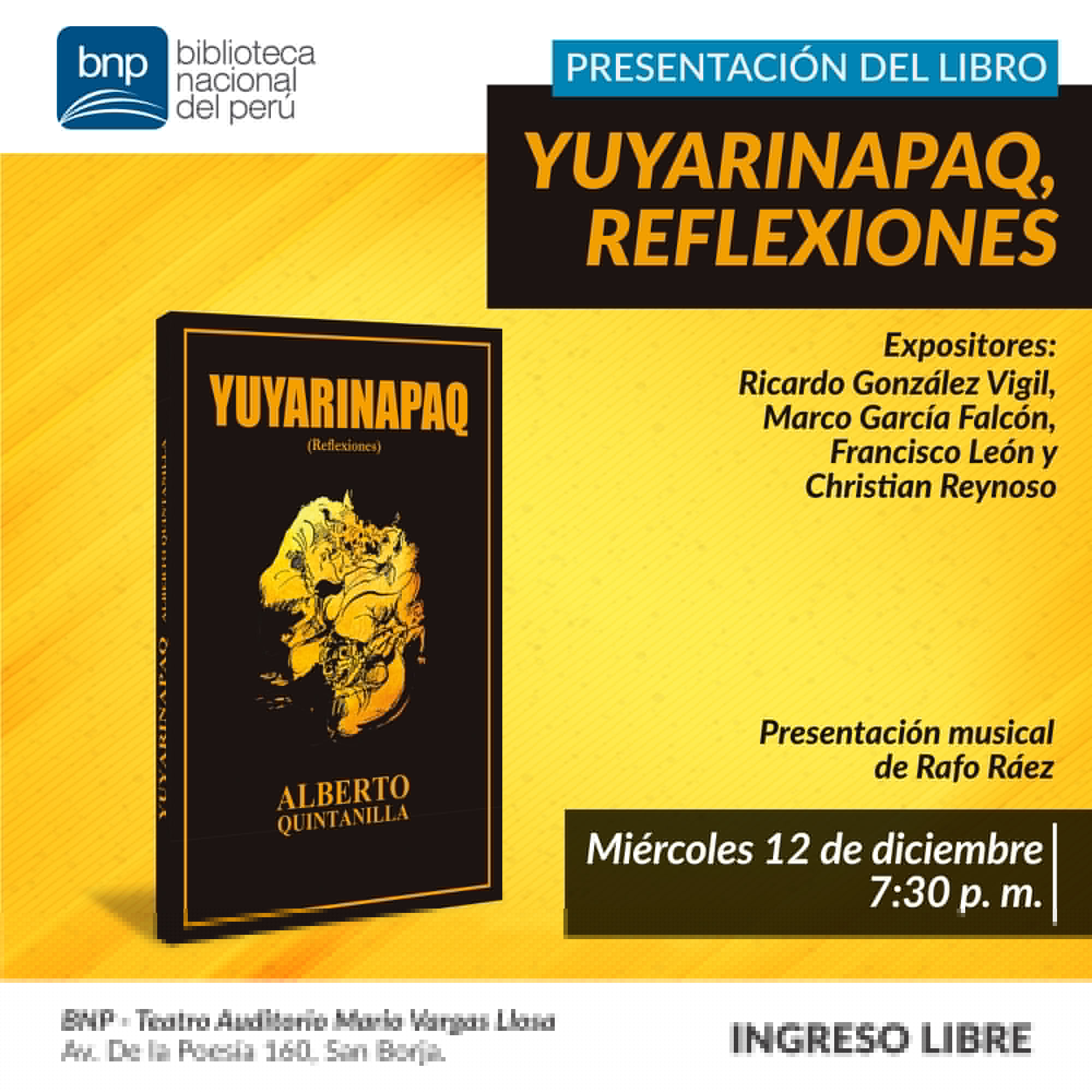 La Biblioteca Nacional del Perú (BNP) invita a la comunidad de lectores a participar de la presentación del poemario Yuyarinapaq, reflexiones, el cual reúne versos inéditos del renombrado escultor y grabador cuzqueño, Alberto Quintanilla.