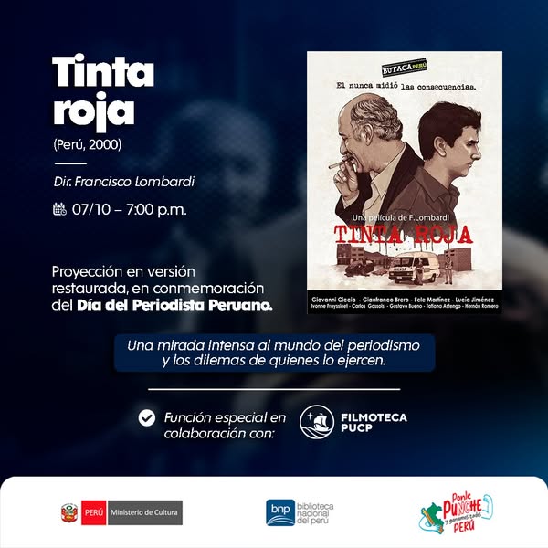 - “Tinta Roja” (2000), el martes 7 de octubre, del director peruano Francisco Lombardi. En conmemoración por el Día del Periodista Peruano, sucedido el 1 de octubre, presentamos esta película que es una adaptación de la novela homónima escrita por el chileno Alberto Fuguet quien, a su vez, se inspiró en personajes de la obra “Conversación en La Catedral” de nuestro Premio Nobel. La cita es en el Teatro Auditorio Mario Vargas Llosa, a las 7 p. m.