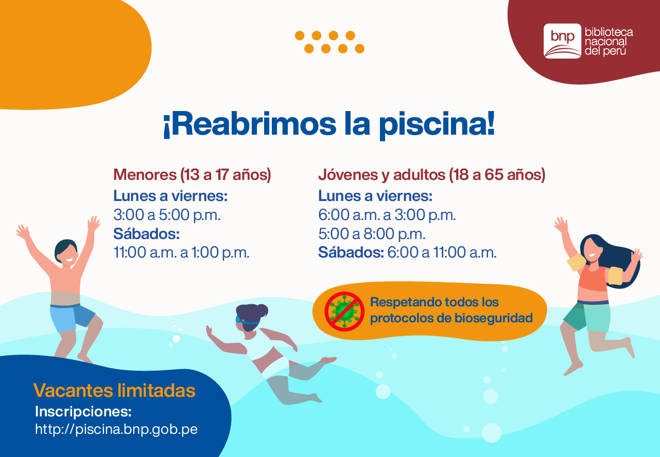 La Biblioteca Nacional del Perú reinició las actividades de la Piscina BNP bajo un estricto protocolo sanitario, en lineamiento con las medidas del Gobierno Central y para la seguridad de todos sus usuarios. La ficha de inscripción se encuentra habilitada para quienes deseen ser parte de esta actividad recreativa de la institución.